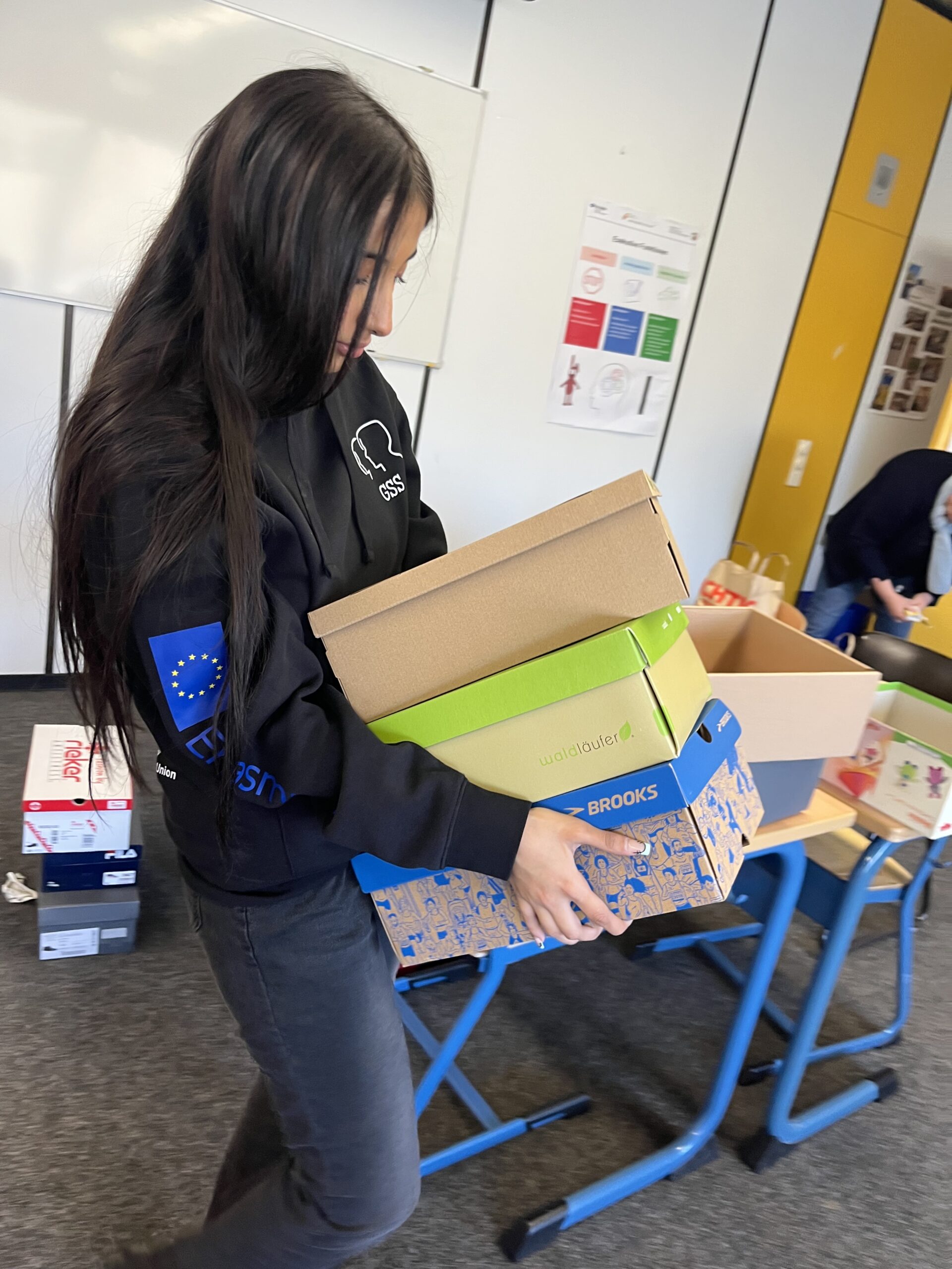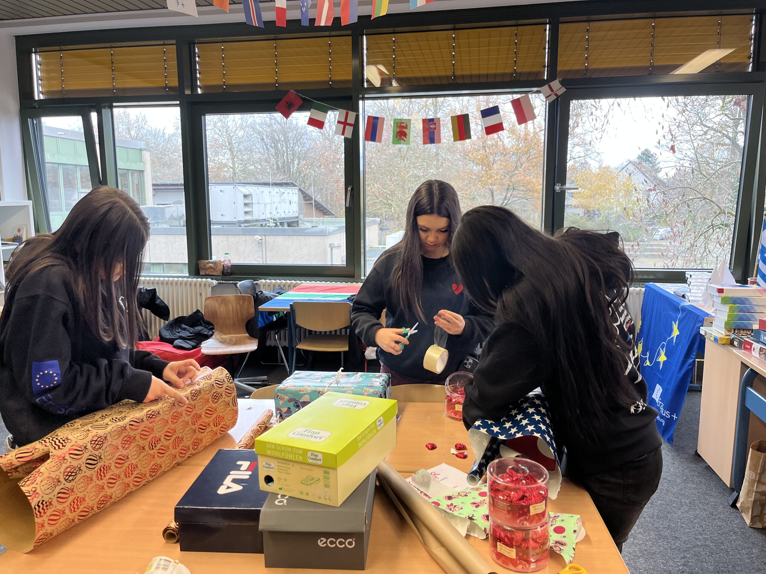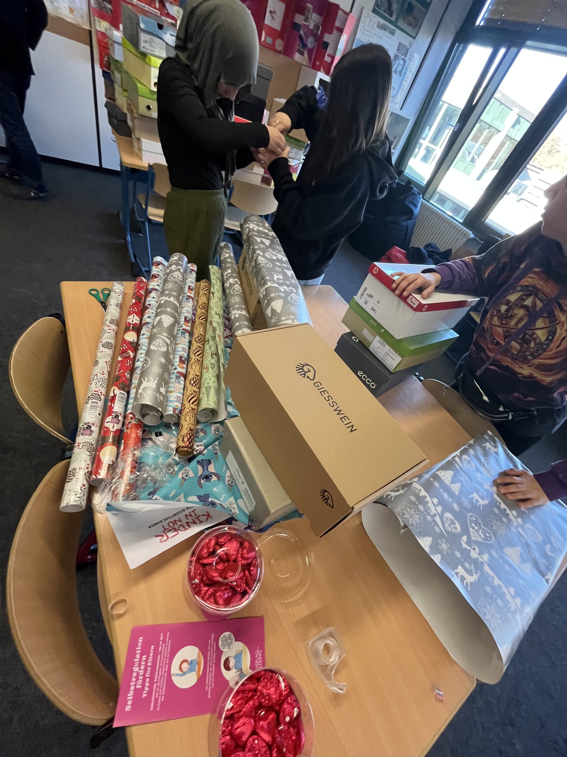 Am Samstag, den 22. November 2025, öffnete die GSS wieder ihre Türen und verwandelte sich beim Tag der offenen Tür in einen Ort voller Begegnungen, Entdeckungen und vorweihnachtlicher Wärme. Auch unser Erasmus+-MakerSpace wurde an diesem Tag zu einem Zentrum festlicher Stimmung und gelebter Solidarität und empfing im Laufe des Tages fast 300 Besucherinnen und Besucher. Unter der Leitung von Simone Herzig engagierten sich das Erasmus+-Team, Schülerinnen und Schüler des 8. Jahrgangs sowie Mitglieder der SV ganz im Sinne unseres Mottos: Für einen Tag wurden sie zu echten H.E.R.O.s. Mit viel Energie und Herz packten sie Geschenke für die gemeinsame Spendenaktion von Erasmus+ und der SV. Die liebevoll zusammengestellten Pakete kommen dank unserer langjährigen Partnerschaft mit der Gütersloher Initiative „Kinder in Not“ benachteiligten Kindern in Rumänien und Ungarn zugute.