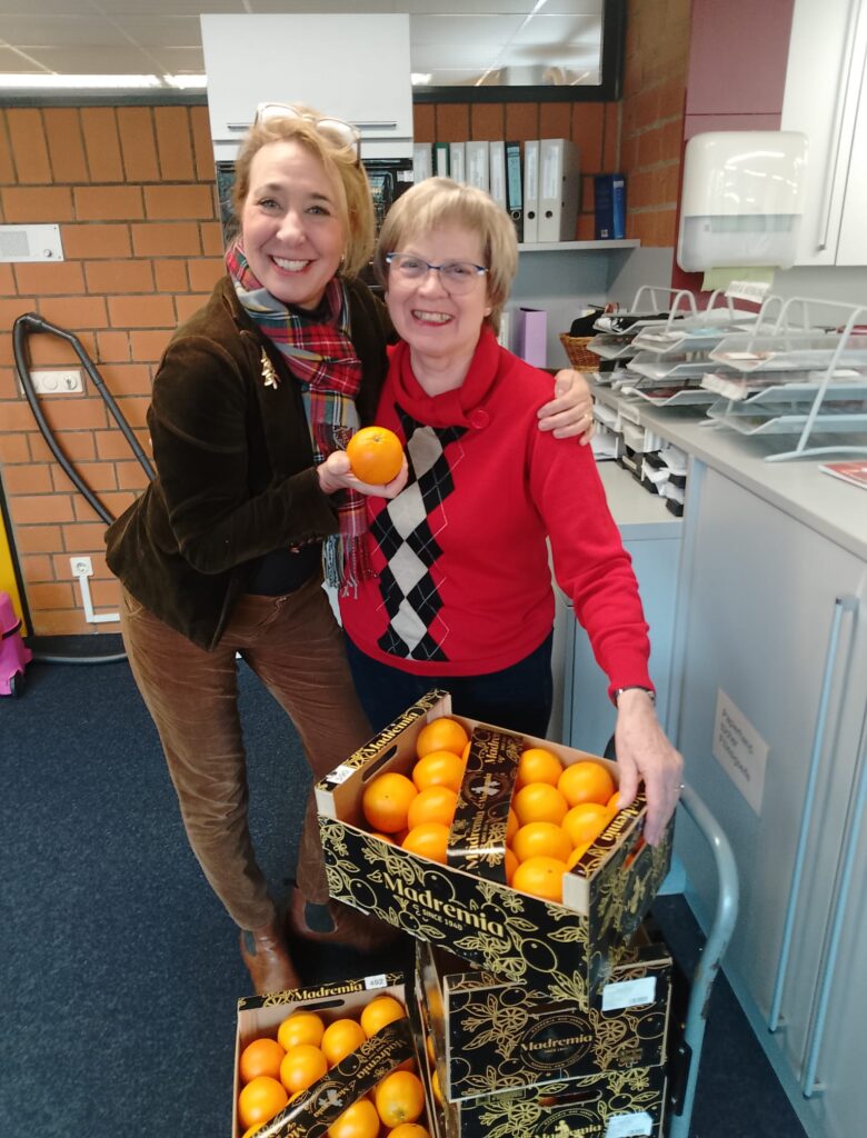 Seit 2006 bringt sie jedes Jahr Kisten voller frischer spanischer Orangen an die Schule – eine Aktion, die mit wenigen Kisten begann und inzwischen Teil einer größeren Gemeinschaftsinitiative geworden ist.