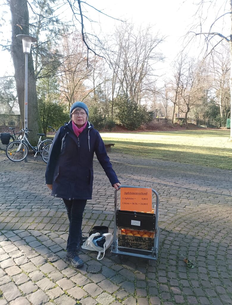 Heute ist Gisela ein wichtiger Teil eines engagierten Teams aus der St.-Pankratius-Kirchengemeinde Gütersloh, das jährlich eine umfangreiche Orangenaktion organisiert, um soziale Projekte zu unterstützen.