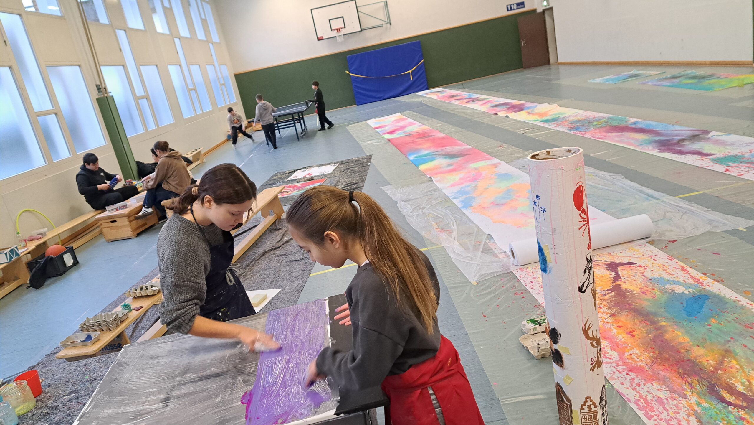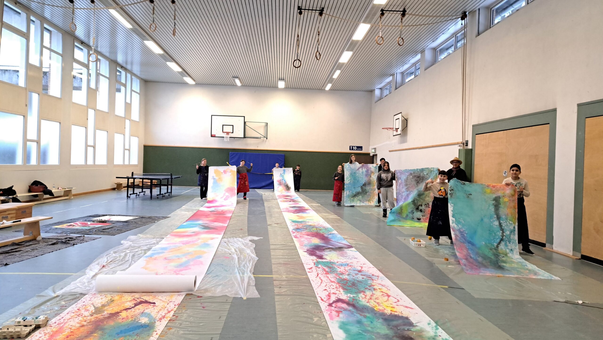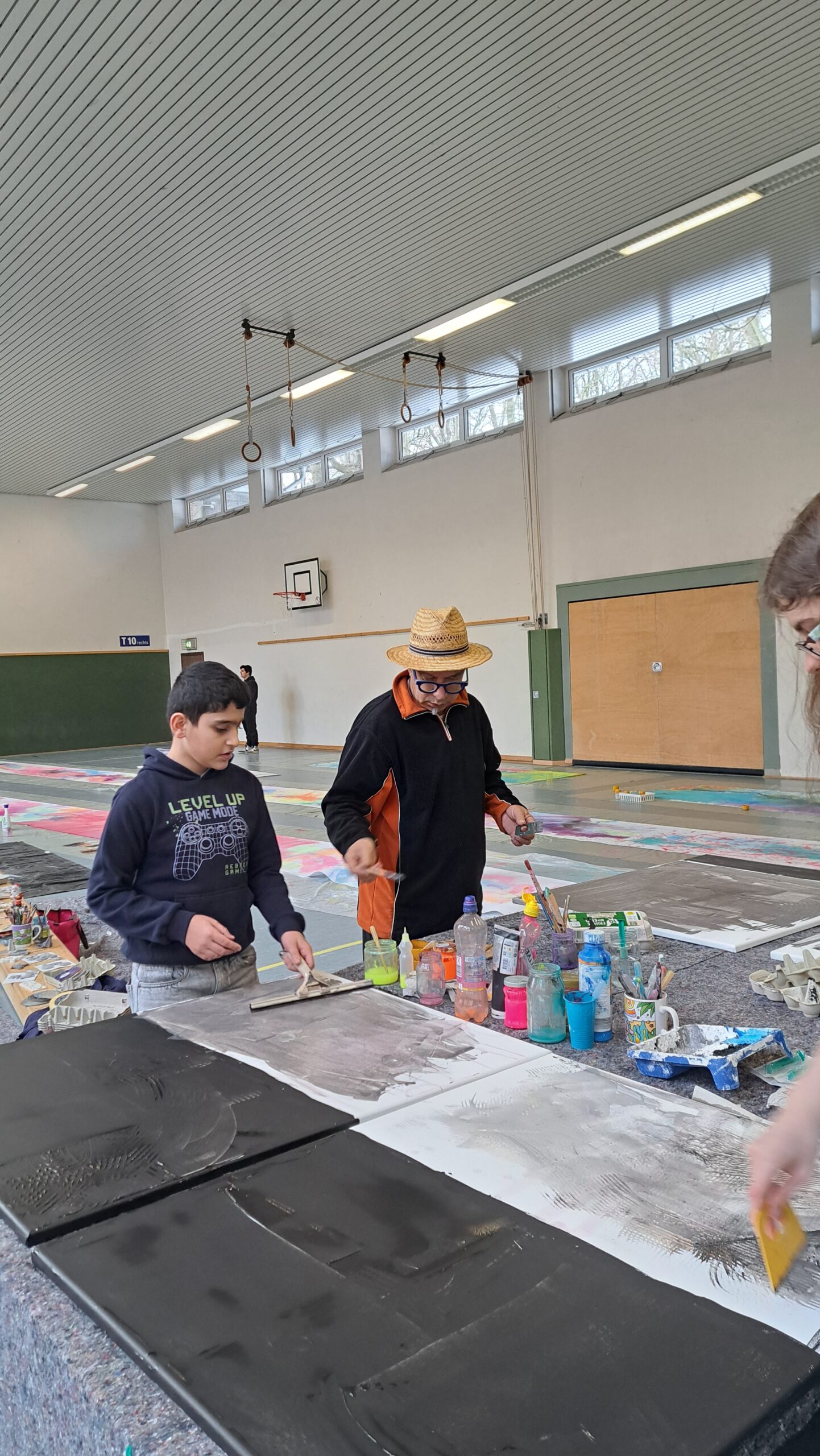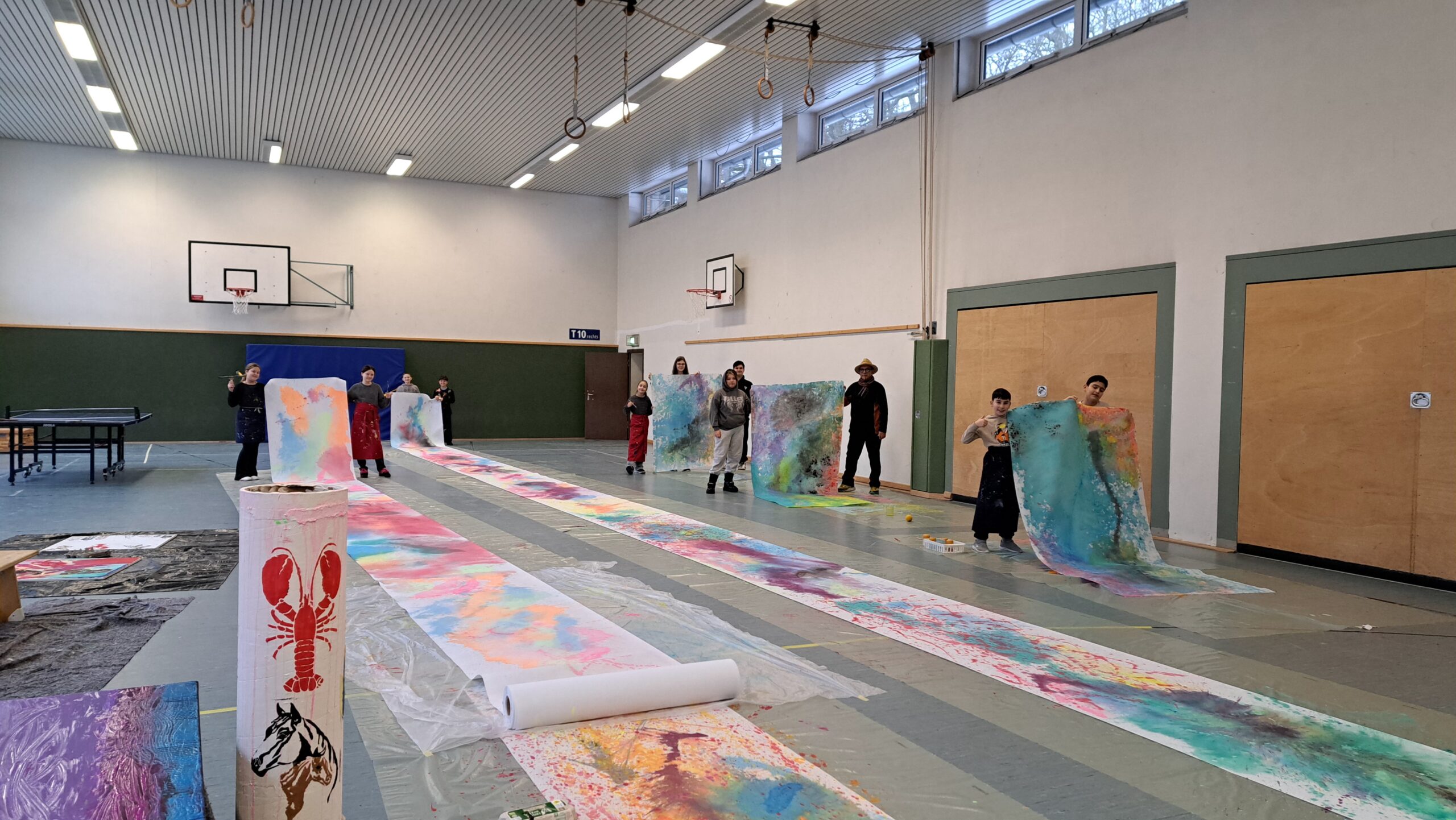 Das gesamte Projekt wurde in der kleinen Sporthalle der GSS durchgeführt. Dort wurde auf langen Stoffbahnen mit Acrylfarbe und in unterschiedlichen Techniken experimentiert und gemalt.