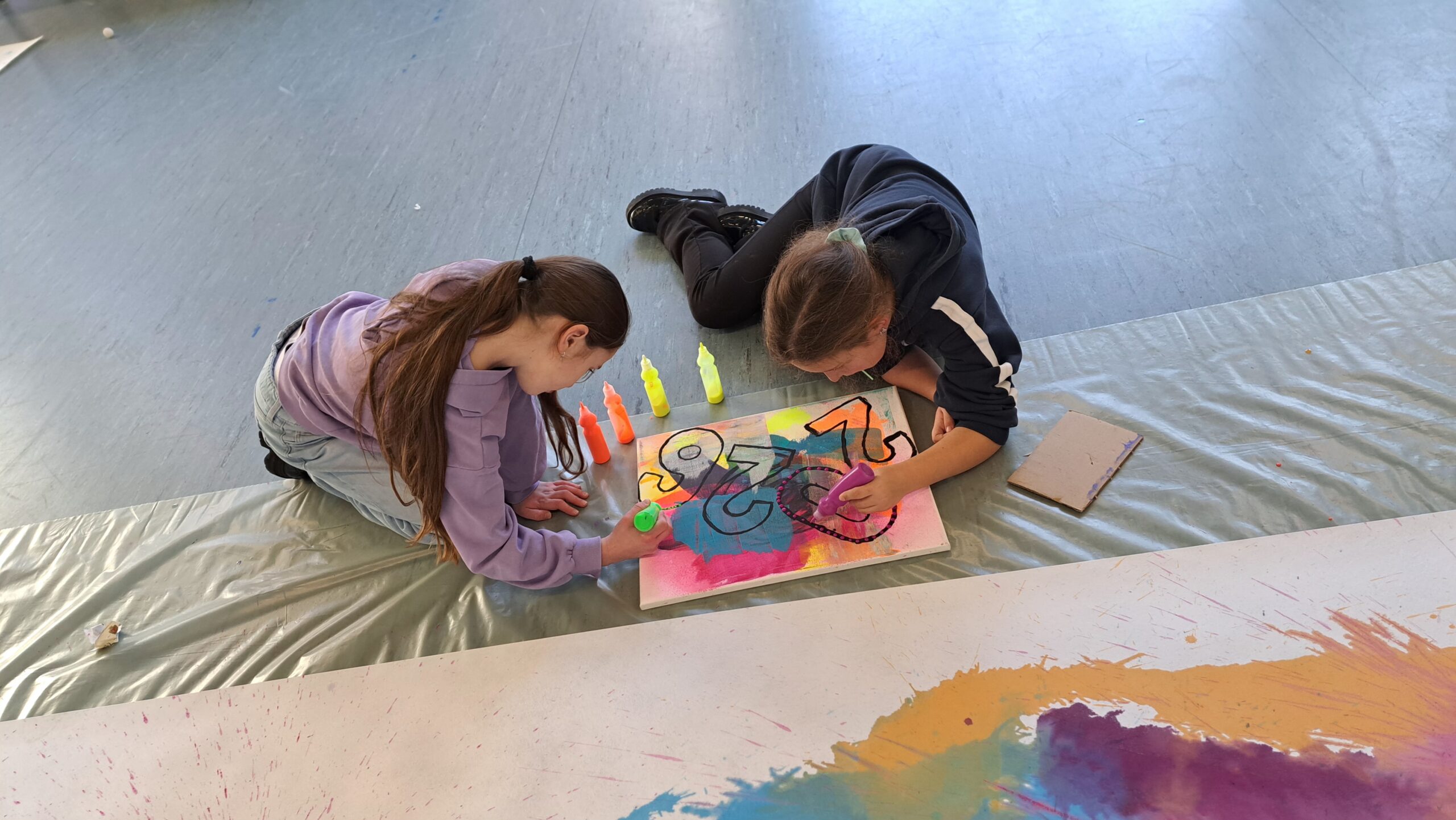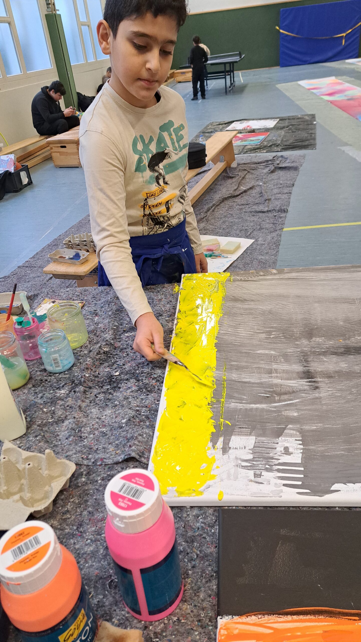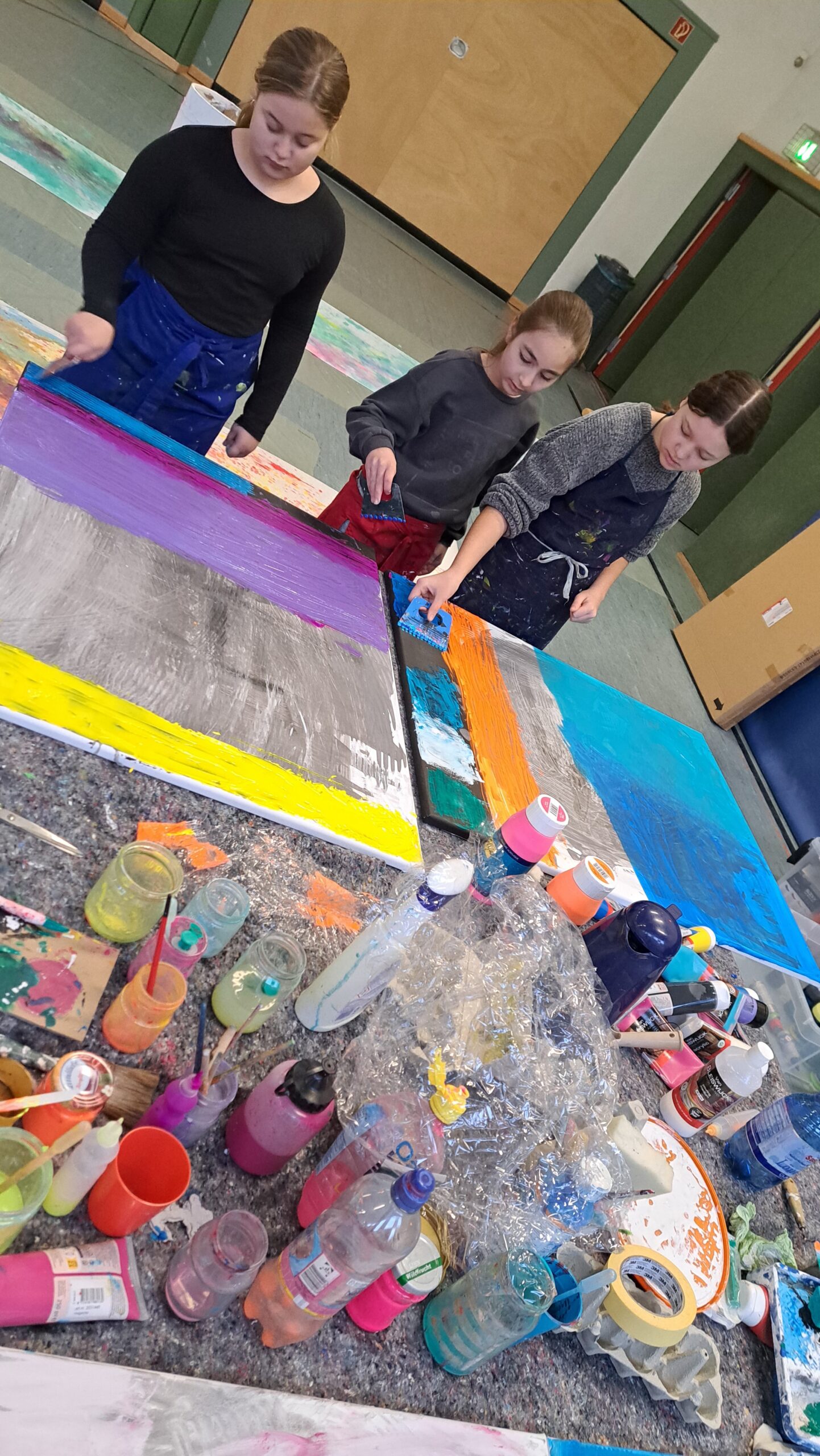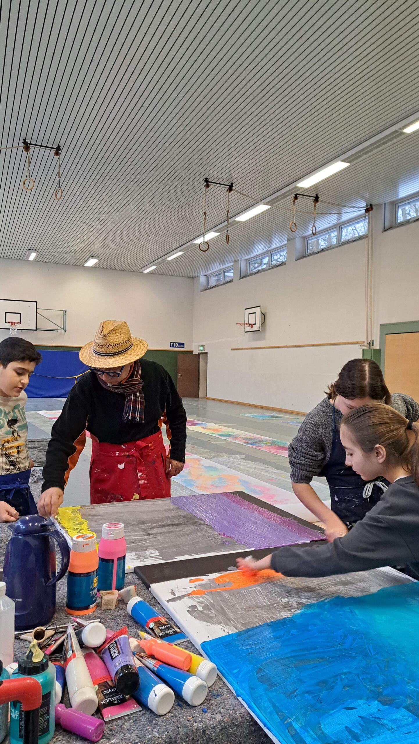 Das gesamte Projekt wurde in der kleinen Sporthalle der GSS durchgeführt. Dort wurde auf langen Stoffbahnen mit Acrylfarbe und in unterschiedlichen Techniken experimentiert und gemalt.